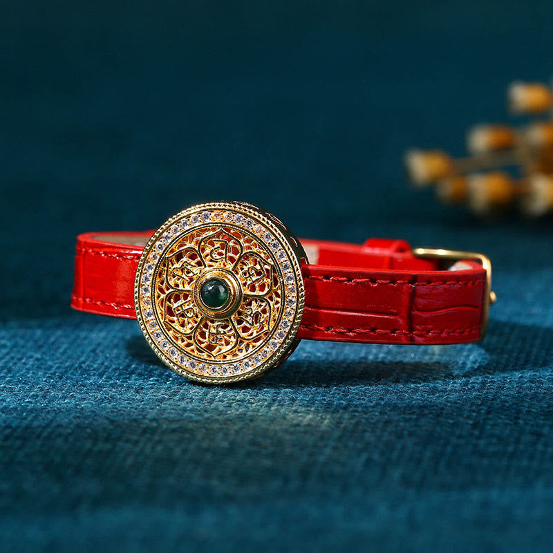 Six True Words Eight Treasures Compass Jade 24K Gold Plated Luck Leather Bracelet