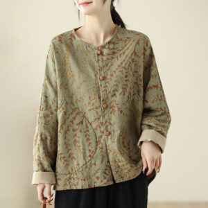 Leaf Print Women’s Cotton Linen Jacket With Pockets
