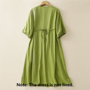 Summer V-Neck Frog-Button Short Sleeve Cotton Linen Women’s Midi Dress