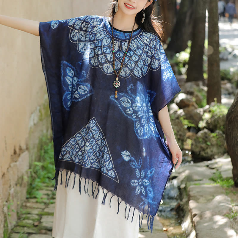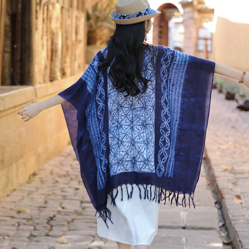 Blue Butterfly Batik Shawl Tassels Cozy Travel Pullover 90*95cm