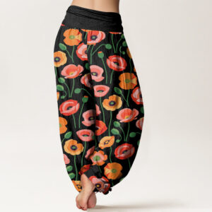 Red Orange Flowers Pattern Women’s Elastic Waist Harem Pants