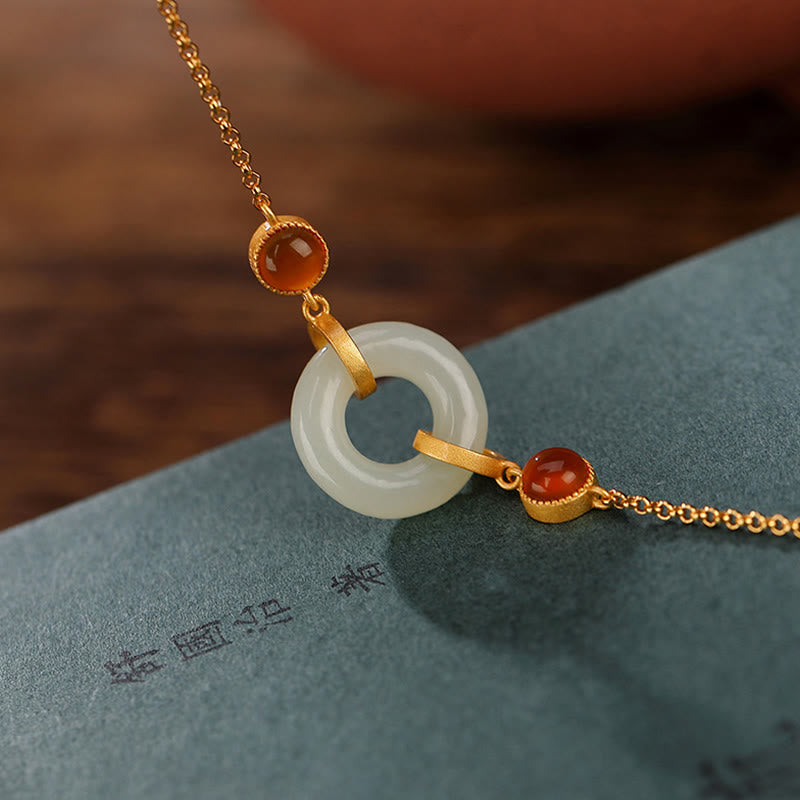 925 Sterling Silver Plated Gold Natural Hetian Jade Peace Buckle Red Agate Luck Bracelet