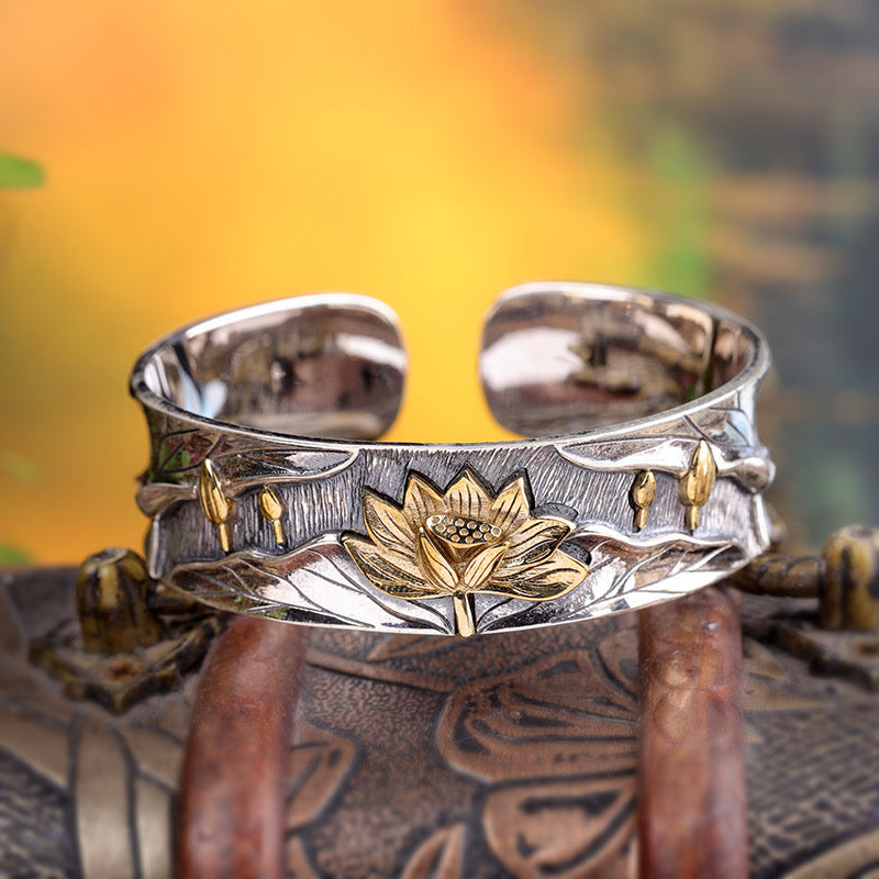 925 Sterling Silver Lotus Flower Calm Bracelet Adjustable Bangle