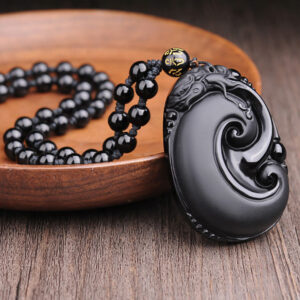 Natural Black Obsidian PiXiu Oval Pattern Strength Necklace Pendant