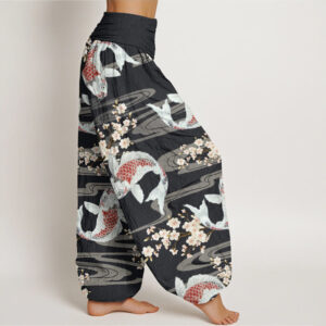 Casual Cherry Blossoms Koi Fish Pattern Women’s Elastic Waist Harem Pants
