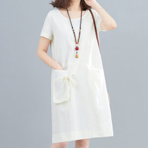 Summer Casual Plain Lace-Up Design Crew Neck Short Sleeve Cotton Linen Midi Dress With Pockets