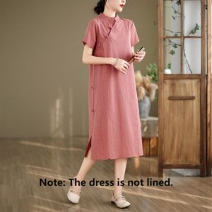 Plain Cheongsam Lace-Up Design Cotton Linen Short Sleeve Midi Dress