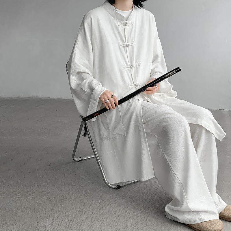 Meditation Cotton Clothing Set features a long-sleeve frog-button shirt and matching pants, crafted from soft, breathable cotton. The loose fit ensures comfort and ease of movement, making it perfect for meditation or relaxation. Designed with a minimalist solid color and practical details, this set offers a blend of simplicity and functionality for peaceful moments.๐