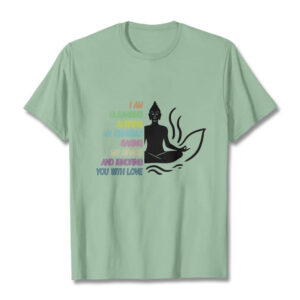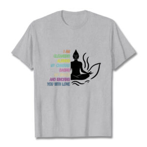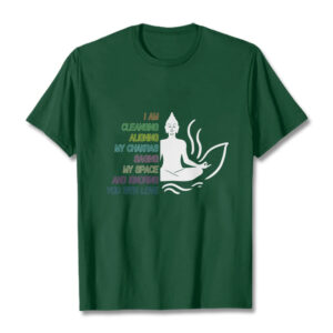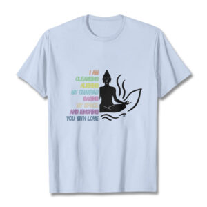 • DESIGN INSPIRATION: This T-shirt’s design combines graphics and quotes. On the right, a minimalist black Buddha statue sits on a lotus leaf, radiating tranquility. On the left, the colorful text reads: “I am cleansing, aligning my chakras, clearing my space, ignoring you with love.”