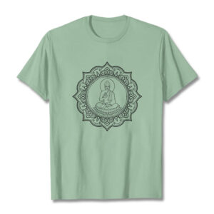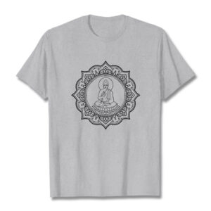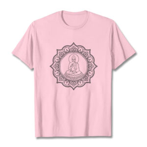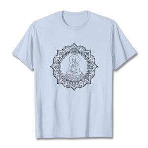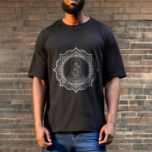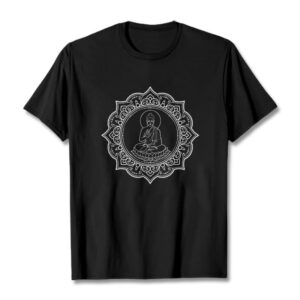 - DESIGN INSPIRATION: This T-shirt features a Buddha statue seated on a lotus, symbolizing tranquility and peace. Surrounding the central figure is an intricate mandala pattern, embellished with ornate curves, dots, and symmetrical patterns. harmony—where opposing forces unite in fluid balance.