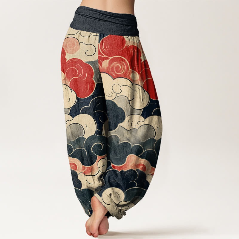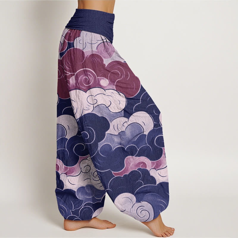 - Design: These women’s yoga harem pants showcase an abstract cloud pattern. These women’s yoga harem pants feature colorful swirling clouds, creating a dynamic, eye-catching visual. The clouds vary in size and shape. The design symbolizes the fluid, changing, and ethereal beauty of the sky, conveying a sense of calm and contemplation. The bold colors and organic forms add a modern twist to the classic pattern, making these pants a standout addition to any activewear collection.