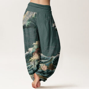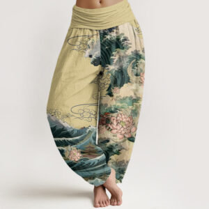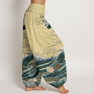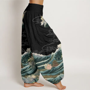 - Design: This harem pants pattern features majestic waves and blooming lotuses, with elegant pavilions surrounded by swirling water. The waves symbolize resilience and strength, the lotuses represent purity and enlightenment, and the pavilions evoke peace and harmony. Together, the design conveys wishes for overcoming challenges with grace and achieving tranquility amidst life’s turbulence.