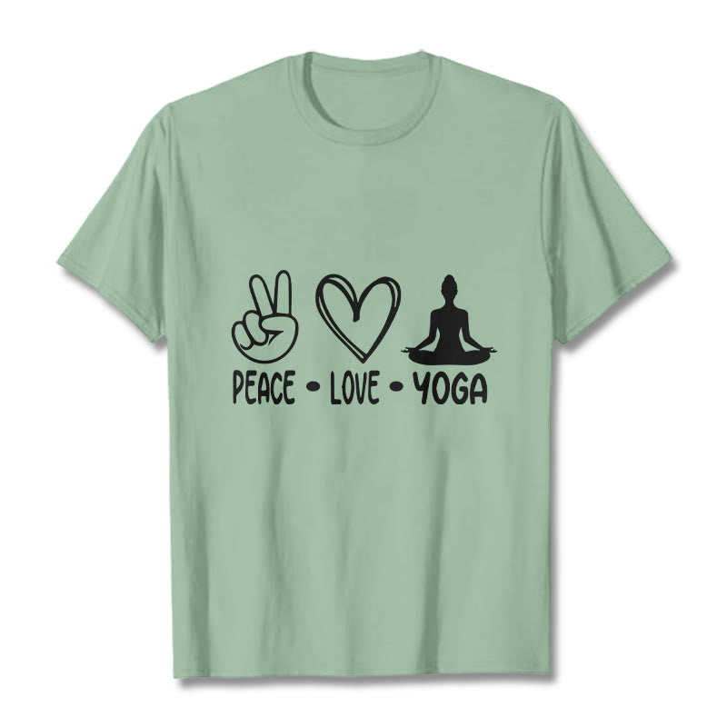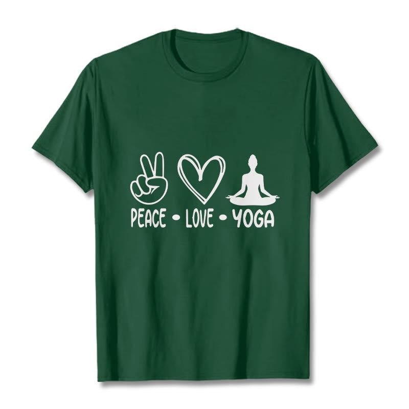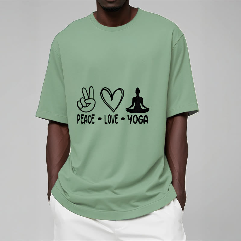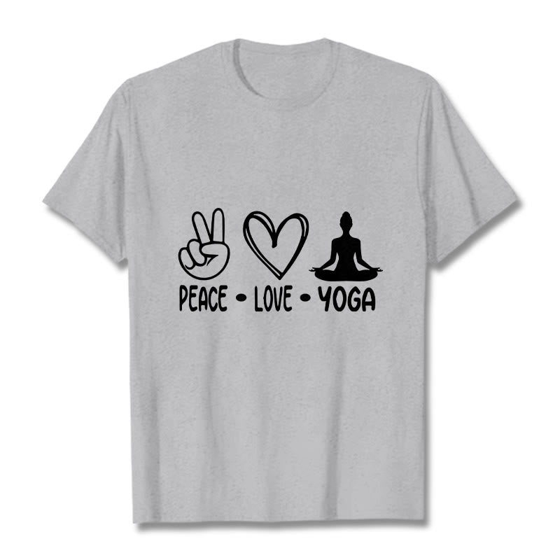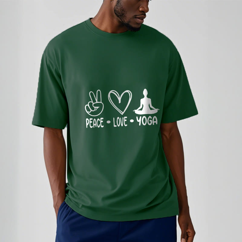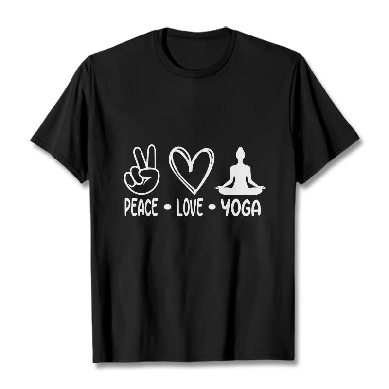 • DESIGN INSPIRATION: The graphic on this T-shirt features a peace sign hand gesture, a heart symbol, and a yoga pose silhouette, alongside the words “Peace – Love – Yoga.” Together, the design expresses a message of inner calm, compassion, and a balanced lifestyle centered around mindfulness and well-being.