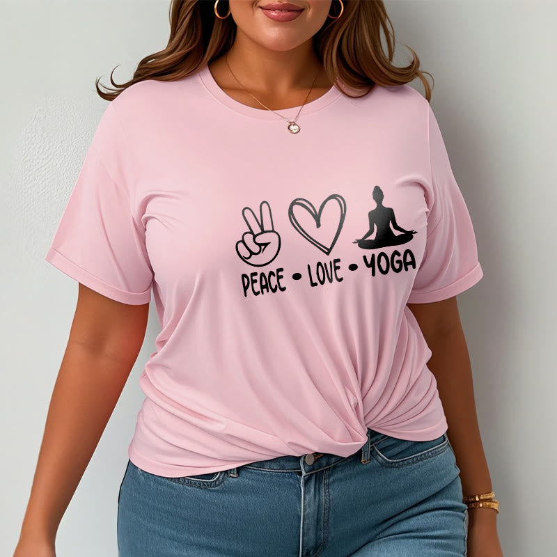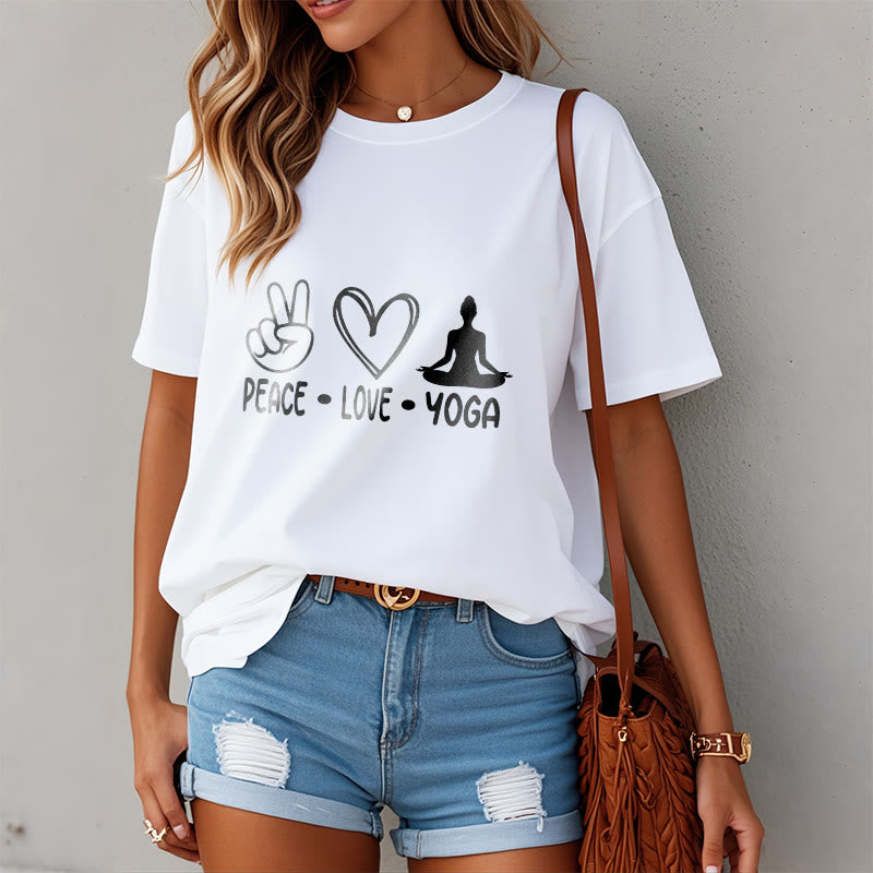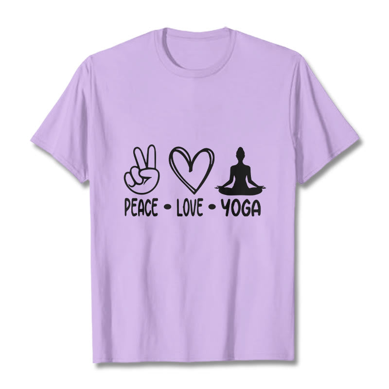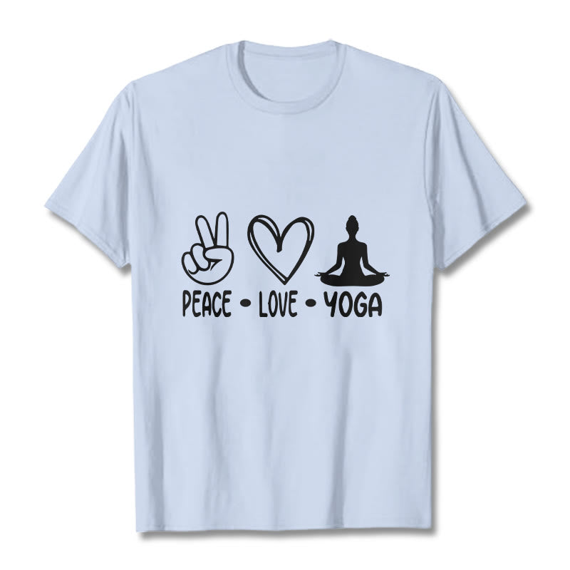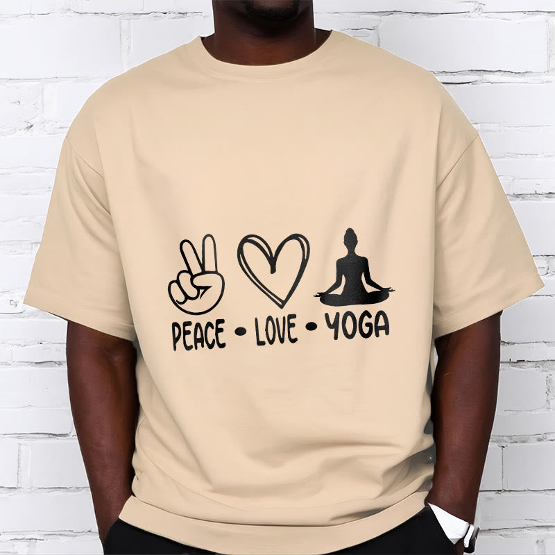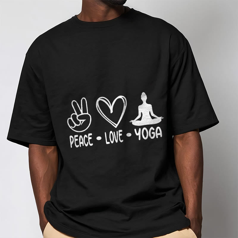 • DESIGN INSPIRATION: The graphic on this T-shirt features a peace sign hand gesture, a heart symbol, and a yoga pose silhouette, alongside the words “Peace – Love – Yoga.” Together, the design expresses a message of inner calm, compassion, and a balanced lifestyle centered around mindfulness and well-being.