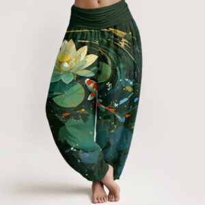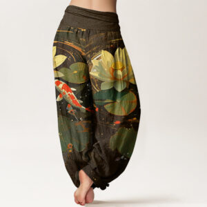- Design: These women’s harem pants showcase a beautiful lotus koi pattern. Koi fish swim gracefully through the waves, and a striking lotus flower rests on a green lily pad. Koi and lotus flowers symbolize good luck and enlightenment, perfect for adding a unique touch to your stylish collection.