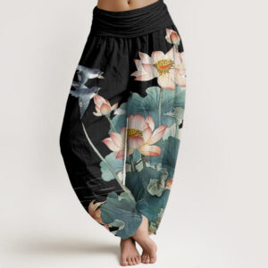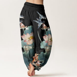 • Design: This women’s harem pants features a beautiful summer lotus pond pattern, with lotus flowers gracefully floating on emerald green lily pads, birds flying above the lotus leaves, and koi swimming under the lotus leaves, embodying an atmosphere of tranquility and elegance. Perfect for adding a unique touch to your stylish collection.