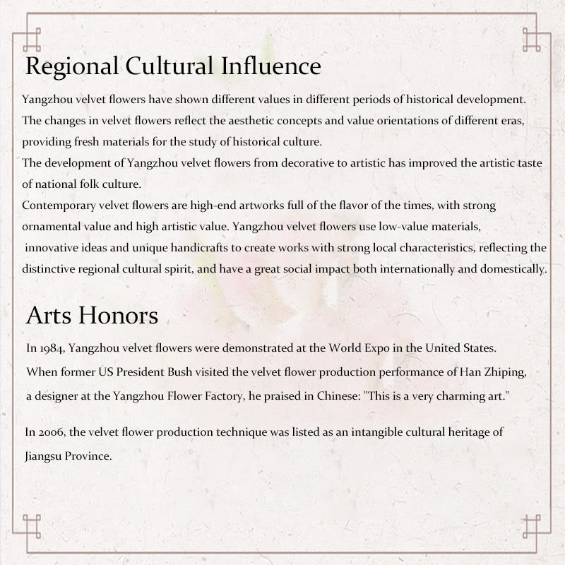 - Preservation of Cultural Heritage: The use of traditional velvet flower craftsmanship highlights the importance of preserving cultural heritage and artisanal skills. This showcases the beauty of handmade craftsmanship, particularly the intricate techniques passed down through generations in regions like Yangzhou.