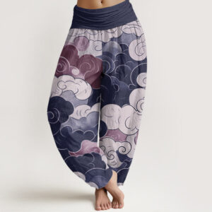 - Design: These women’s yoga harem pants showcase an abstract cloud pattern. These women’s yoga harem pants feature colorful swirling clouds, creating a dynamic, eye-catching visual. The clouds vary in size and shape. The design symbolizes the fluid, changing, and ethereal beauty of the sky, conveying a sense of calm and contemplation. The bold colors and organic forms add a modern twist to the classic pattern, making these pants a standout addition to any stylish collection.