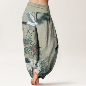 Red-crowned Crane Pine Tree Mountain Harem Pants feature intricate patterns of red-crowned cranes, pine trees, and mountains, each symbolizing vitality, resilience, and serenity. The cranes, with their detailed feathers and vibrant vermilion accents, represent longevity and grace. The pine trees symbolize strength and endurance, while the mountains evoke a peaceful and grounded spirit. Crafted from breathable fabric, these pants offer comfort and flexibility, perfect for moments of tranquility and mindfulness.💕