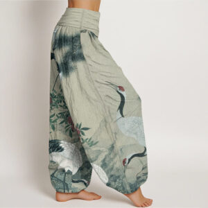 - Design: The harem pants feature Red-crowned Cranes, Pine Trees, and Mountain patterns. The red-crowned cranes are either spreading their wings to fly, or looking for food, or walking leisurely. Each of their feathers is meticulously detailed, the contrast between black and white is sharp, and the touch of vermilion adds a bit of vividness to the picture. The pine trees are tall and lush, and the mountains and bushes create a hazy and peaceful atmosphere. These elements make the pants not only fashionable but also full of meaning.
