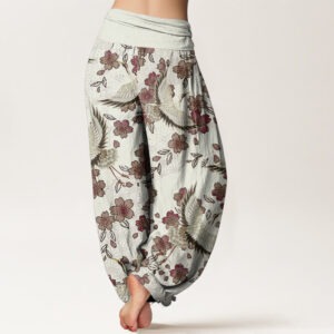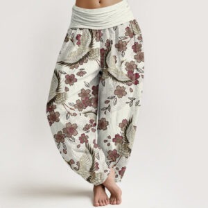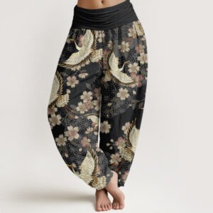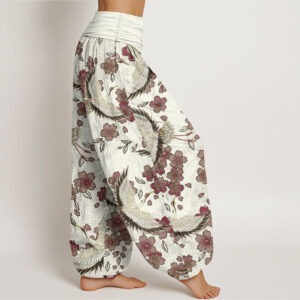 • Design: The Harem pants featuring Crane and peach blossom patterns combine symbols of longevity and good fortune with those of love, beauty, and prosperity, as cranes represent long life and peach blossoms signify romance and auspicious beginnings. This design embodies a harmonious blend of cultural and natural motifs, celebrating life’s abundance and harmony.