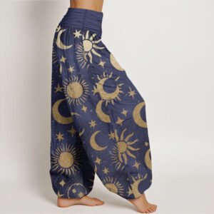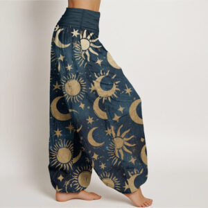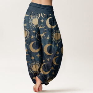 Pure Cotton Crescent Moon Sun Stars Pattern Design Women's Elastic Waist Harem PantsPure Cotton Crescent Moon Sun Stars Pattern Design Women’s Elastic Waist Harem Pants