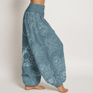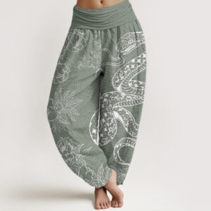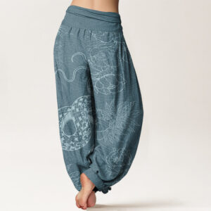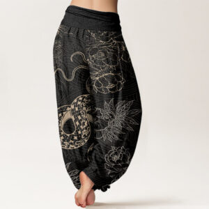 • Design: The harem pants featuring snakes and lotus flowers symbolizes wisdom, purity, and transformation. In many cultures, the snake represents knowledge and renewal, while the lotus signifies spiritual enlightenment and resilience, together embodying a harmonious balance between strength and beauty.