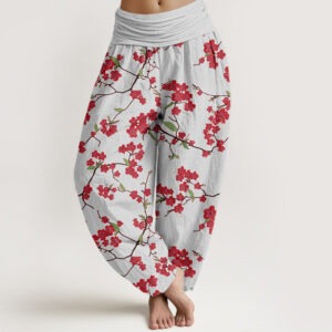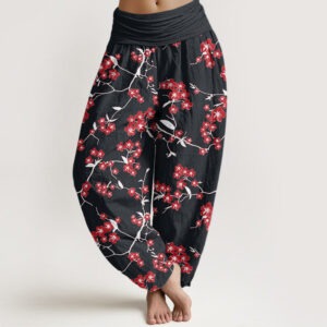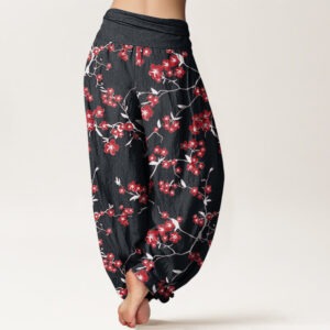 - Design: The pattern featuring red peach blossoms on these Harem Pants symbolizes spring, love, and longevity, drawing from traditional Chinese culture where peach blossoms represent beauty, renewal, and auspiciousness, as well as the promise of a harmonious and prosperous life. This motif evokes both romantic and life-affirming qualities, enhancing the pants with meanings of vitality and good fortune.