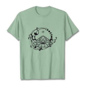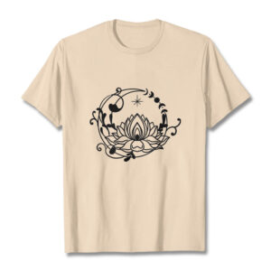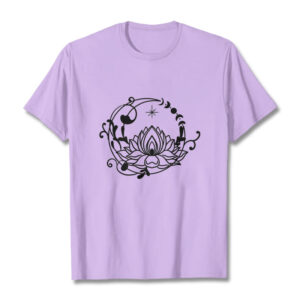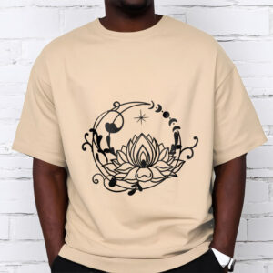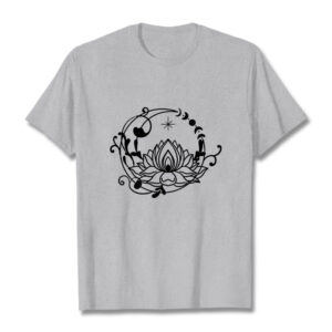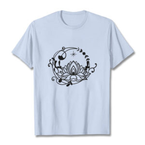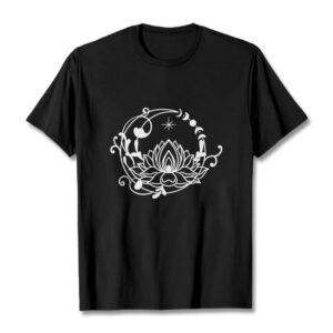 - DESIGN INSPIRATION: This T-shirt features a lotus flower encircled by moon phases and flowing vines, symbolizing growth, renewal, and harmony with nature and the cosmos.