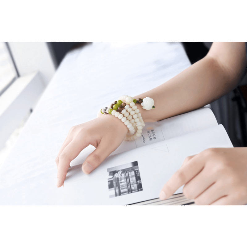 In Sanskrit, the term “Bodhi” means “awakened” or “enlightened.” Each bead in this mala bracelet/necklace is made of seeds from various Bodhi plants considered sacred in Buddhism. The seeds were meticulously polished to the point of resembling white jade, thus the name.